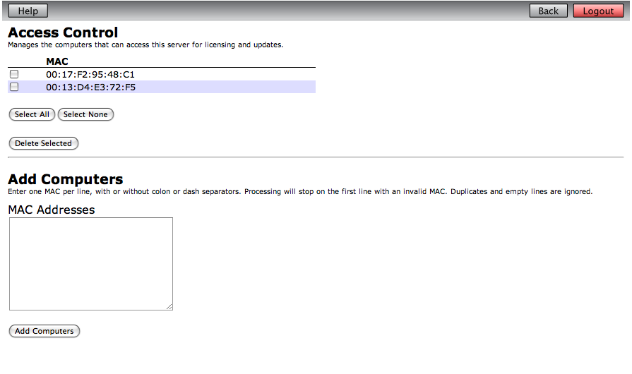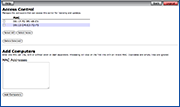 Computers are identified by their MAC address, the physical address of their network adapter. The list at the top of the page shows the MACs that have have been defined (see screenshot 1). Add MACs by entering their MACs in the Add Computers edit field. You can enter as many MACs as you need, one on each line. The MAC can be entered in any one of the following forms: