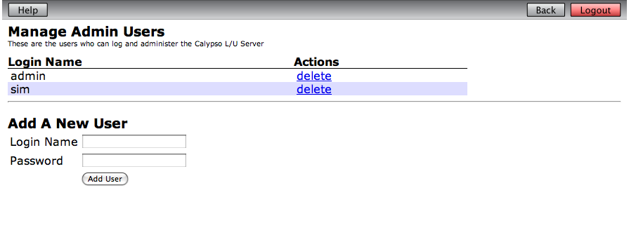 To access the FrontRow Calypso L/U Service administration web site, users must enter a user name and password to authenticate themselves with the service. The Manage Admin Users (see screenshot 2) page allows you to add and remove users, so granting or revoking access.
